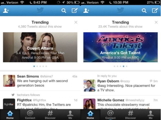 ล่าสุด บางส่วนของผู้ใช้ Twitter ผ่านแอพพลิเคชันสำหรับอุปกรณ์ iOS ระบุว่าได้เห็นระบบแบนเนอร์ใหม่ที่ Twitter ทดลองแสดงไว้ในแอพพลิเคชัน โดยแสดงเป็นแบนเนอร์รายการทีวีที่เป็นกระแสฮิตในขณะนั้นหรือ “trending TV show” ไว้ที่ด้านบนสุดของหน้าหลักของผู้ใช้แต่ละคน ซึ่งเรียกความสนใจจากผู้ใช้ได้ไม่น้อย