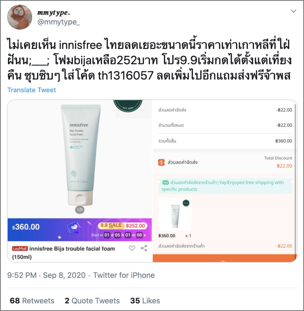 เคล็ดลับ: เริ่มต้นบทสนทนาด้วยการปล่อยโค้ดพิเศษหรือบอกรายละเอียดเกี่ยวกับการจัดโปรโมชั่นของแบรนด์ สร้างเอ็นเกจกับอินฟลูเอ็นเซอร์บนทวิตเตอร์ เพื่อทวีตถึง “ของมันต้องมี” ซึ่งจะช่วยให้นักช้อปทั้งหลายเกิดความต้องการซื้อสินค้า
