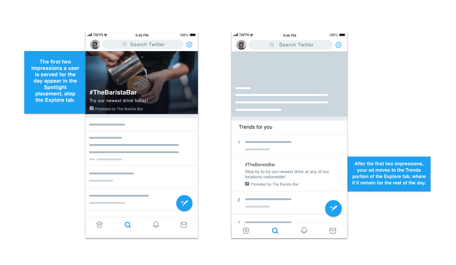 ทั้งนี้ Promoted Trend Spotlight จะเข้ามาเสริมฟีเจอร์โฆษณา Promoted Trend เดิม ด้วยการเพิ่มลูกเล่นในการใช้วิดีโอความยาว 6 วินาที, ภาพ GIFs หรือภาพนิ่ง แสดงบนแท็บ Explore บนทวิตเตอร์ โดยผู้ใช้งานทวิตเตอร์ที่ล็อกอินเข้ามาบนทวิตเตอร์จะสามารถมองเห็นคอนเทนท์ของแบรนด์ได้ถึง 2 ครั้งต่อวัน และยังให้อิสระกับแบรนด์ในการสลับสับเปลี่ยนอาร์ตเวิร์คโฆษณาได้ตลอดทั้งวัน เพื่อให้สามารถเข้าถึงกลุ่มลูกค้าได้ดียิ่งขึ้น หากผู้ใช้งานทวิตเตอร์ได้มีการคลิกเข้ามาชมโฆษณา 2 ครั้งภายในวันนั้นแล้ว โฆษณาตัวนั้นจะถูกย้ายไปเป็นโฆษณาแบบ Promoted Trend ปกติและจะเห็นคอนเทนท์แบบออร์แกนิกแทน