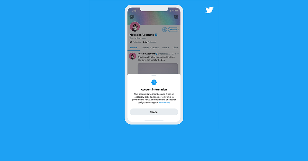 การยืนยันตัวตนเป็นเพียงส่วนหนึ่งของงานที่ทวิตเตอร์ทำเพื่อให้ผู้ใช้งานทราบได้ว่ากำลังสื่อสารกับใครอยู่ ซึ่งเป็นหัวใจสำคัญของการสนทนาสาธารณะ นั่นเป็นเหตุผลที่ว่าทำไมทวิตเตอร์จึงเริ่มให้มีการติดป้ายรับรองบัญชีให้กับหน่วยงานรัฐบาล สื่อที่เกี่ยวข้อง รวมถึงการออกแบบวิธีในการแบ่งประเภทบัญชีใหม่ๆ เพิ่มเติมอีกด้วย
