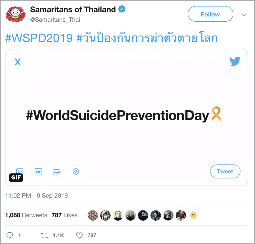 Twitter ร่วมมือกับ สมาคมสะมาริตันส์แห่งประเทศไทย (@Samaritans_Thai) เปิดตัว บริการแจ้งเตือน #ThereIsHelp เพื่อป้องกันการฆ่าตัวตายและการทำร้ายตนเองในประเทศไทย สืบเนื่องในจากวันสุขภาพจิตโลก
