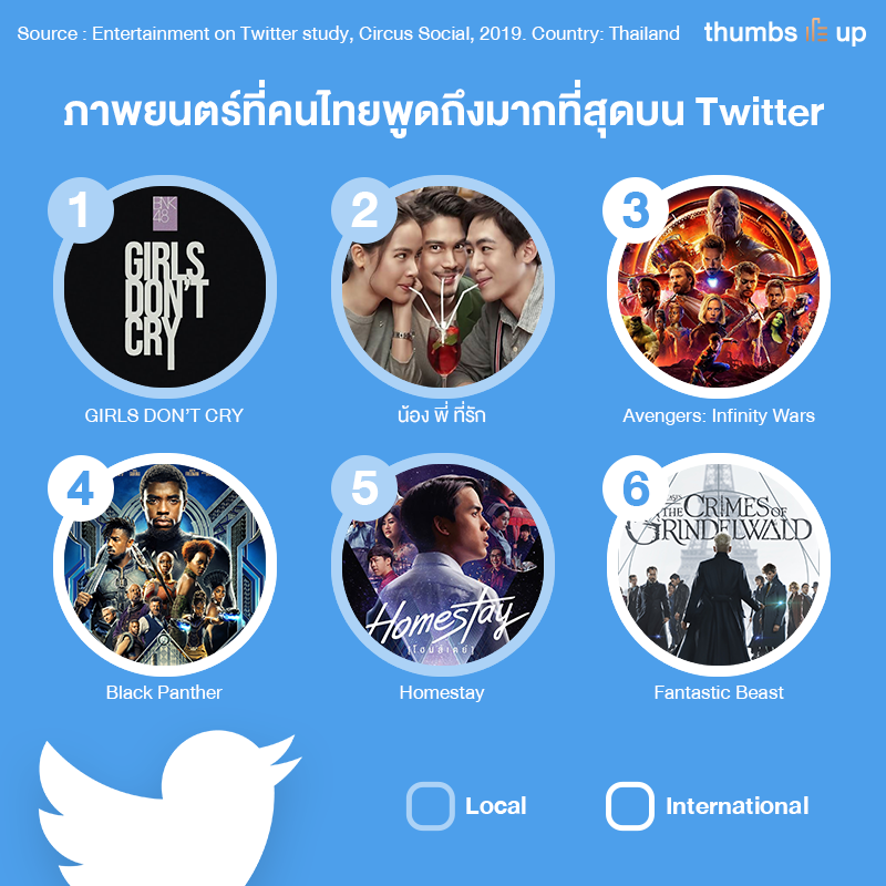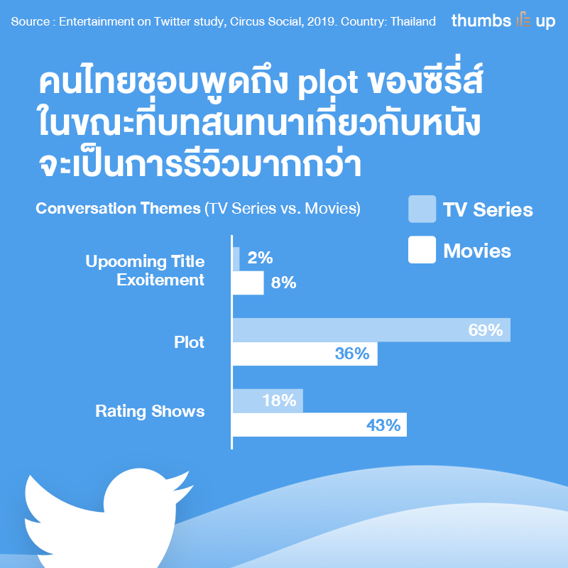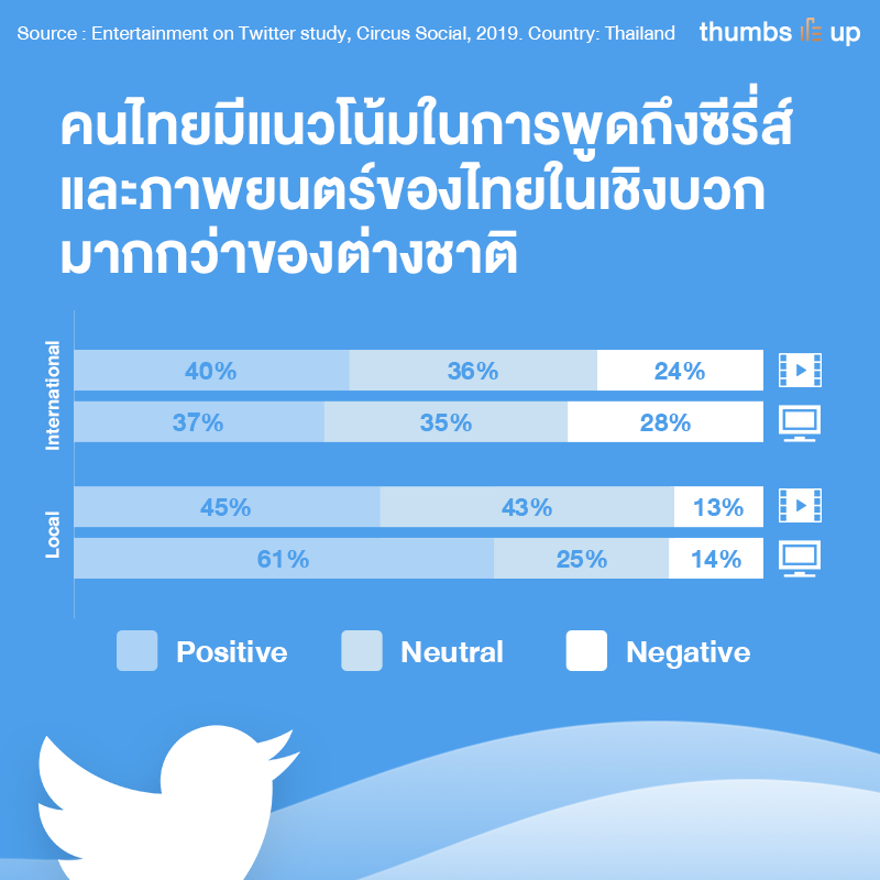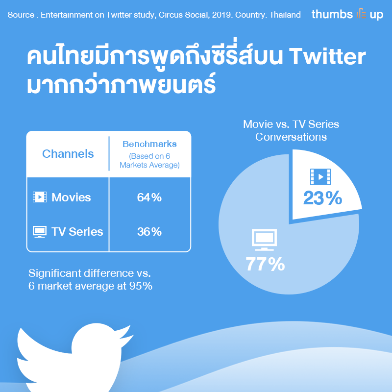 ทวิตเตอร์ เปิดผลการวิจัยจาก 500,000 ทวีตโดย Twitter ร่วมกับ Circus Social ต้นปี 62 สะท้อนภาพผู้ใช้งานทวิตเตอร์ชาวไทยมีการรับชมรายการโทรทัศน์และภาพยนตร์ไทยมากกว่าต่างประเทศ และพบว่าคนไทยทวีตข้อความเกี่ยวกับละครมากกว่าภาพยนตร์ในสัดส่วน 77% และ 23% ตามลำดับ สวนกระแสเทรนด์ในภูมิภาคเอเชีย ตะวันออกเฉียงใต้ที่มีบทสนทนาเกี่ยวกับภาพยนตร์ 64% และซีรีส์ 36%