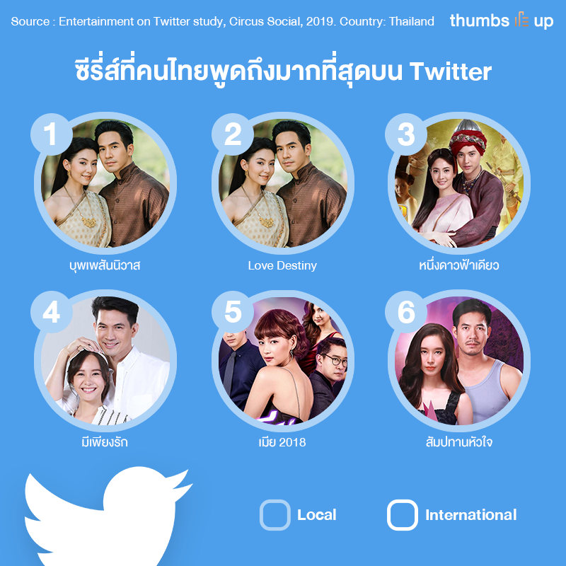 ขณะที่การสนทนาบนทวิตเตอร์ประเทศไทยมีอัตราการสนทนาเกี่ยวกับรายการโทรทัศน์ไทยสูงที่สุด ซึ่งเป็นเทรนด์เดียวกันทั้ง ภูมิภาคเอเชียตะวันออกเฉียงใต้ มีการทวีตถึงละครโทรทัศน์ไทย 77% เมื่อเทียบกับทวีตที่พูดถึงซีรีส์ต่างประเทศ 23%