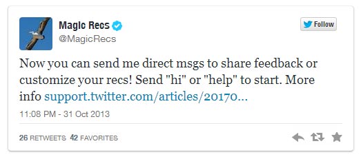 เพื่อแก้ปัญหานี้ ทาง Twitter จึงเปิด account ขึ้นมาใหม่โดยใช้ชื่อว่า Magic Recs หรือ @MagicRecs เพื่อช่วยให้ผู้ใช้เลือกตั้งค่าให้กับระบบแนะนำ ผ่านการส่งข้อความทวีต ซึ่งผู้ใช้สามารถส่งข้อความไปหาได้โดยตรง (Direct message) หรือจะใช้การตอบกลับก็ได้