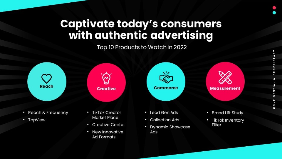 ด้าน TikTok เองมีโซลูชั่นที่จะช่วยให้แบรนด์บรรลุทุกวัตถุประสงค์การตลาด ตอบโจทย์สำหรับทุกแบรนด์ไม่ว่าจะเป็นธุรกิจขนาดไหน โดยนำบางส่วนของไฮไลท์ที่น่าสนใจในแต่ละโซลูชั่นสำหรับปี 2022 มาแนะนำ ได้แก่