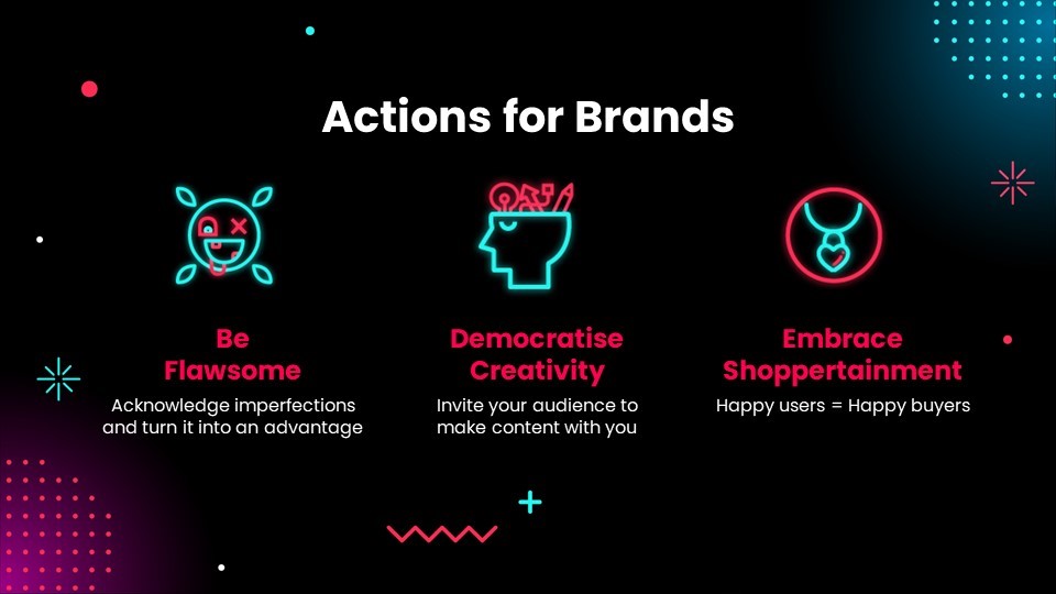 Be ‘flawsome’ ซึ่งมาจากการนำคำว่า Flaw มารวมกับ Awesome ซึ่งนั่นคือการแสดงตัวตนส่วนที่เปราะบางหรือไม่สมบูรณ์ของแบรนด์อย่างเปิดเผย ชัดเจน และตรงไปตรงมาอย่างมั่นใจ เป็นการดึงจุดด้อยขึ้นมาใช้ ให้เกิดประโยชน์ Democratise Creativity ความสร้างสรรค์อย่างเท่าเทียม แบรนด์สามารถเชิญชวนให้ผู้ใช้งานเข้ามามีส่วนร่วมในการสร้างสรรค์เนื้อหาและแชร์เรื่องราวดีๆ ไปพร้อมกันได้บน TikTok
