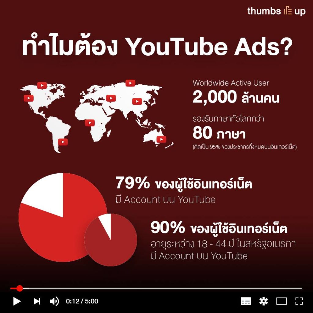ส่วนเหตุผลที่นักการตลาดควรเลือกใช้การโฆษณาบนแพลตฟอร์ม Youtube นั้น เป็นเพราะมีผู้ใช้งานทั่วโลกกว่า 2,000 ล้านยูสเซอร์ รองรับกว่า 80 ภาษาทั่วโลก 79% ของผู้ใช้งานอินเทอร์เน็ตจะมีบัญชียูทูปไว้ใช้งาน รวมทั้ง 90% ของผู้ใช้อินเทอร์เน็ตในสหรัฐช่วงอายุ 18-44 ปี จะมีบัญชีบนยูทูปเกือบทุกคนแล้ว
