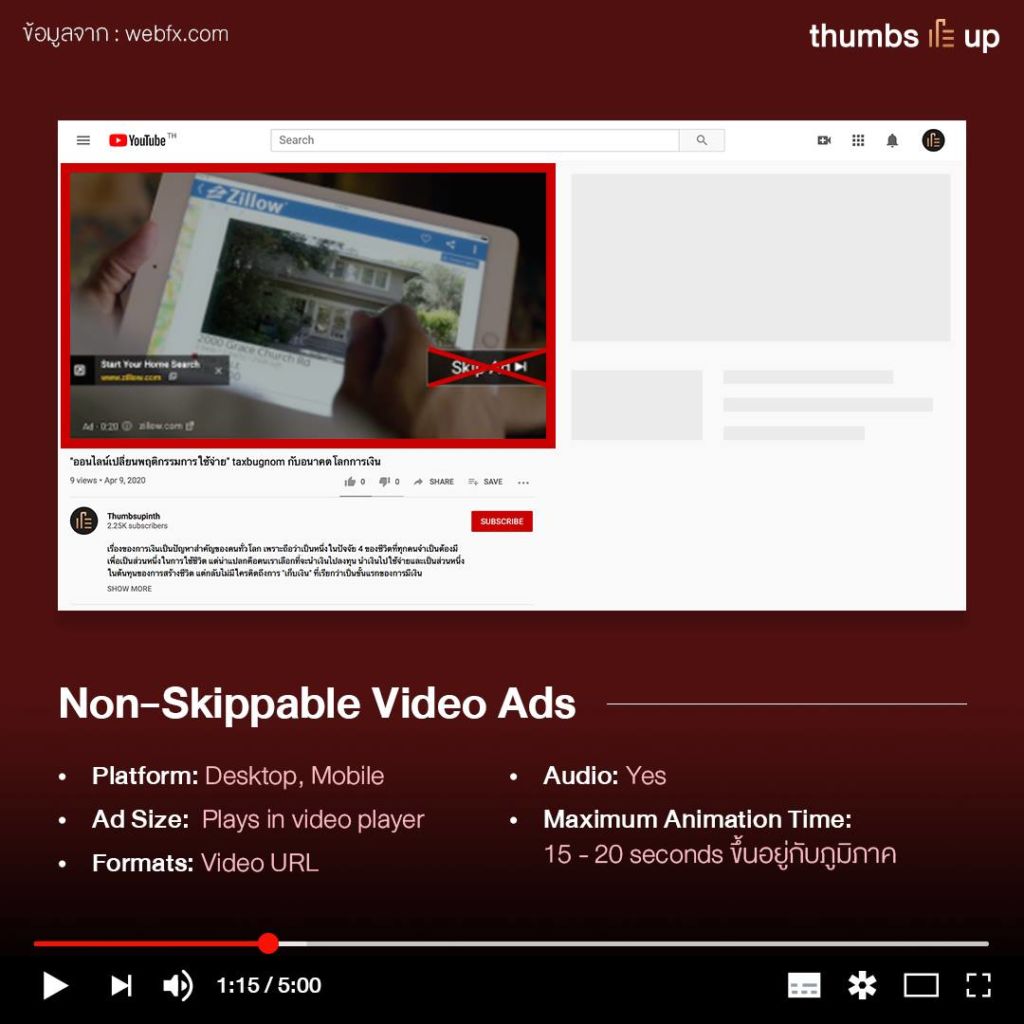 NON-SKIPPABLE VIDEO ADS เป็นโฆษณาวีดีโอที่กดข้ามไม่ได้ และจะปรากฏในบางช่วงของคลิปวีดีโอ ซึ่งผู้ชมต้องดูให้จบก่อนถึงจะดูเนื้อหาถัดไปได้