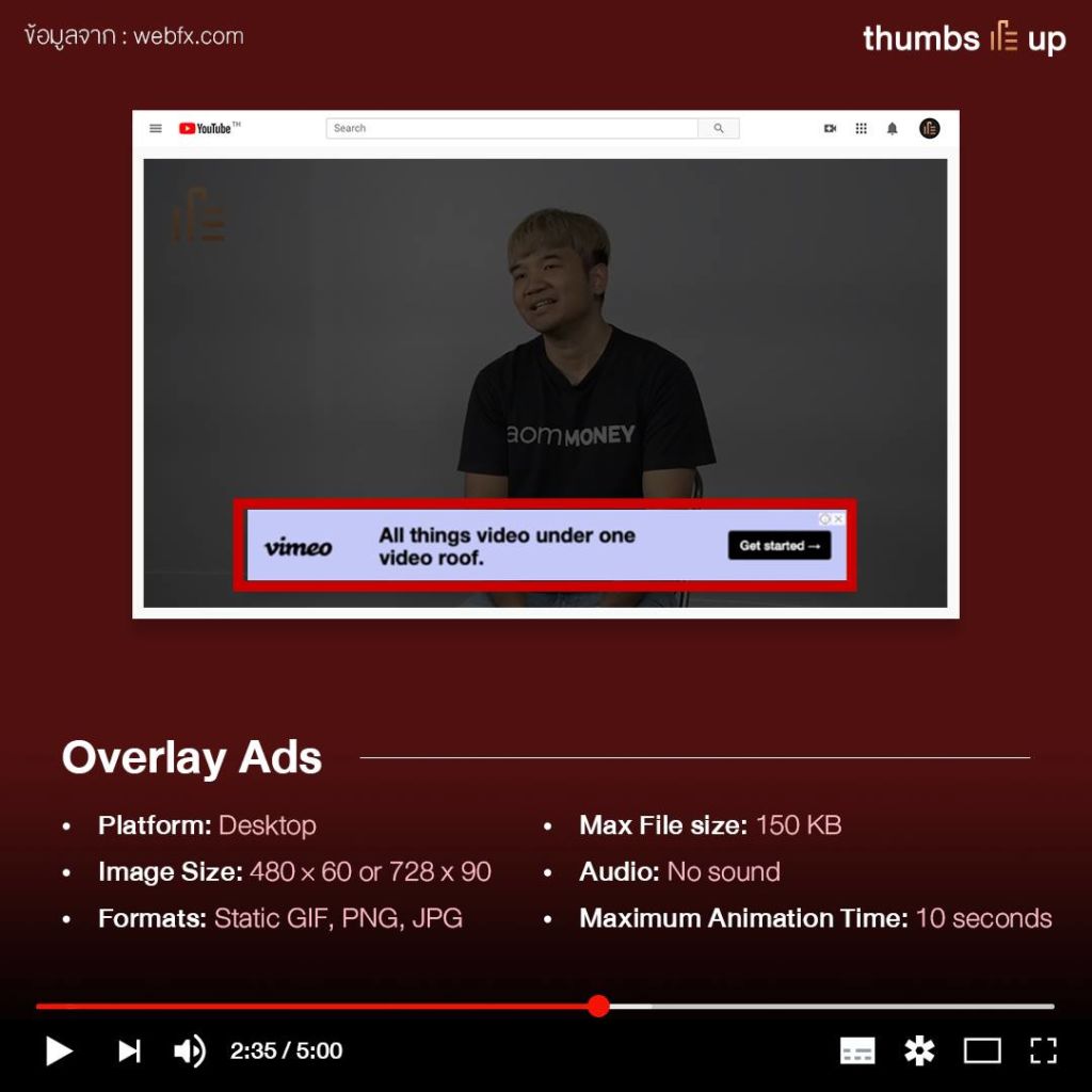 รูปแบบโฆษณานี้จะเป็นแถบโฆษณาประมาณ 20% ของคลิปวีดีโอ โดยจะปรากฏเนื้อหาด้านล่างเหมือนเป็นแบนเนอร์เล็กๆ ซึ่งแน่นอนว่าการโฆษณาแบบนี้จะเพิ่มการรับรู้แบรนด์ แม้ว่าเนื้อหาจะทับซ้อนกับคลิปวีดีโอแต่ก็ยังไม่รบกวนสายตาผู้ชมมากนัก