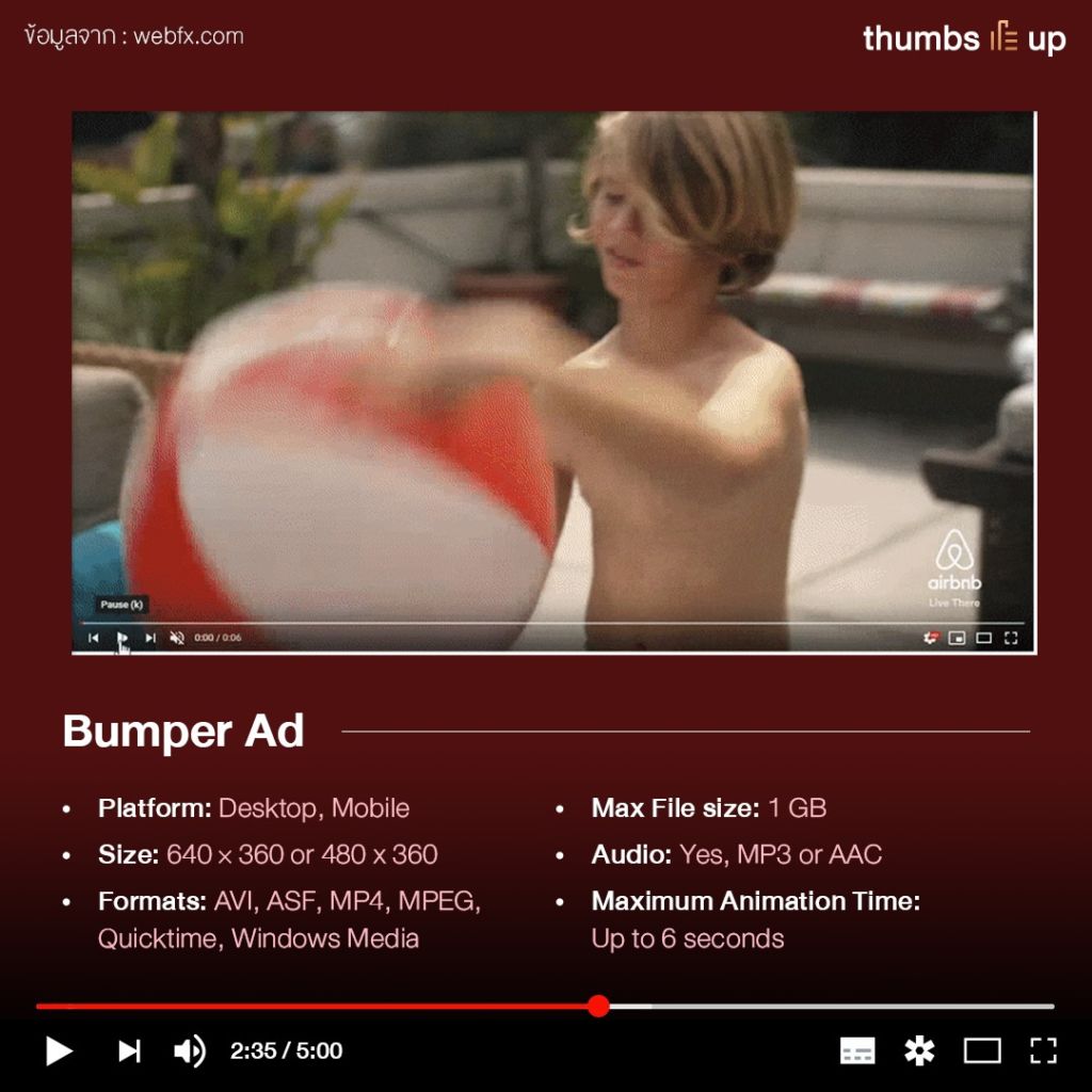 โฆษณาบัมเปอร์ เป็นโฆษณาวีดีโอแบบสั้นที่เล่นก่อน ระหว่างหรือหลังคลิปวีดีโอ ซึ่งโฆษณาเหล่านี้จะมีเนื้อหาสั้นๆ ประมาณ 6 วินาทีหรือน้อยกว่านั้น ช่วยสร้างการรับรู้แบรนด์ได้ดี