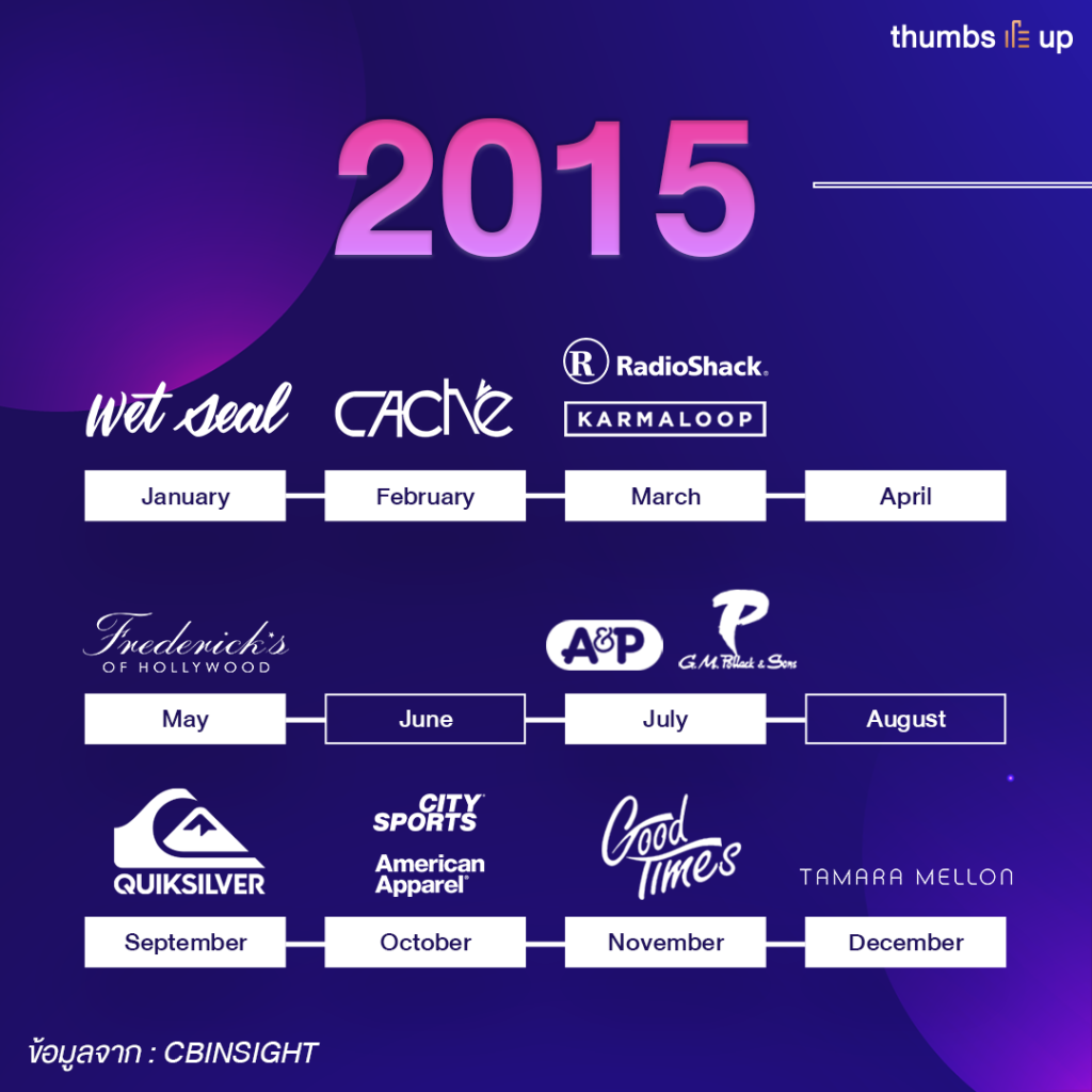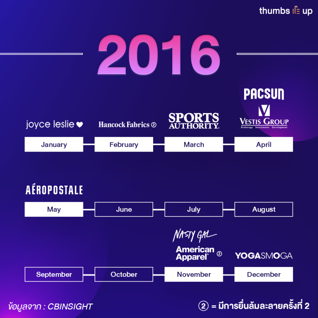 แต่นอกจาก Walmart แล้ว จะเห็นได้ว่าแบรนด์อื่น ๆ ที่ยื่นล้มละลายในปีนี้เกือบทั้งหมดเป็นธุรกิจเกี่ยวกับเสื้อผ้าแฟชั่น (นอกจากนั้นจะเป็นธุรกิจอุปกรณ์กีฬา) ซึ่งส่วนมากจะถูก disrupt โดยตรงจากแพลตฟอร์มออนไลน์อย่าง Amazon เพราะแบรนด์ไม่สามารถสร้างระบบ e-commerce มาสู้ในตลาดปัจจุบันได้ และ แบรนด์ American Apparel ที่เพิ่งยื่นล้มละลายเพื่อปรับโครงสร้างภายในไปในปี 2015 ก็ต้องมีการยื่นล้มละลายอีกครั้งเนื่องจากไม่สามารถฟื้นฟูแบรนด์กลับมาได้