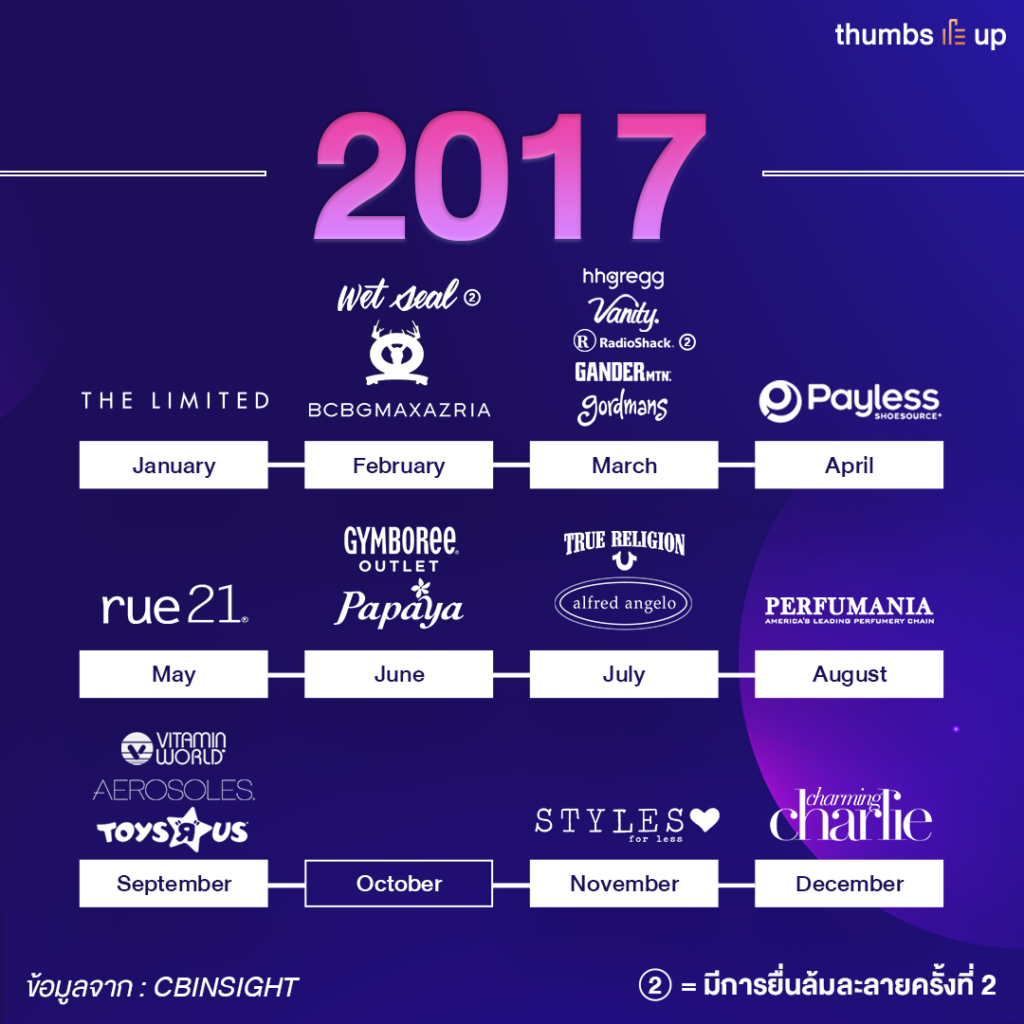 ในปี 2017 การยื่นล้มละลายส่วนใหญ่ก็ยังคงเป็นเรื่องของปัญหาหนี้สิน และการ disrupt จากแพลตฟอร์มออนไลน์เช่นเดียวกัน มีการลดสาขาลงอีกมากมายหลายร้อยสาขา แต่จะสังเกตได้ว่าหลาย ๆ แบรนด์จะเริ่มรู้ตัว และปรับตัวอย่างรวดเร็ว และหากแบรนด์ไหนทำได้ก็จะทำให้การสามารถหลุดออกจากสถานะล้มละลายได้รวดเร็วยิงขึ้น