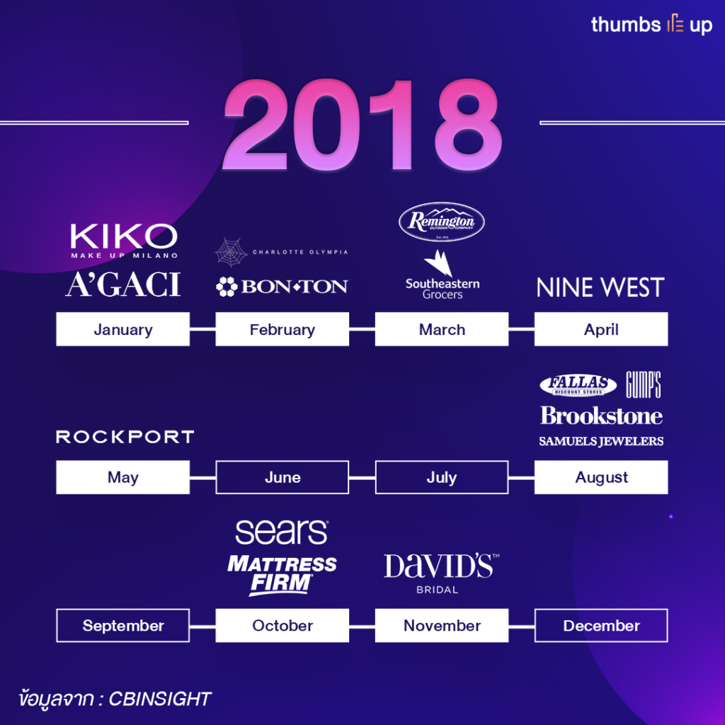 จะสังเกตได้ว่าในปี 2018 แม้ว่าหลาย ๆ แบรนด์จะเริ่มพยายามผันตัวเองให้เป็น e-commerce จากการเปลี่ยนแปลงที่ชัดเจนของพฤติกรรมผู้บริโภค แต่ในตลาด e-commerce ตอนนี้ก็มีคู่แข่งเยอะทั้งรายใหญ่และรายย่อยจนไม่สามารถสู้ไหว ทำให้แบรนด์ที่ยังมีหน้าร้าน และต้องลงทุนกับหน้าร้านที่มีสาขามากมาย ไม่สามารถนำรายได้จาก e-commerce ที่แม้จะเติบโตขึ้นเรื่อย ๆ มาทดแทนได้หมด