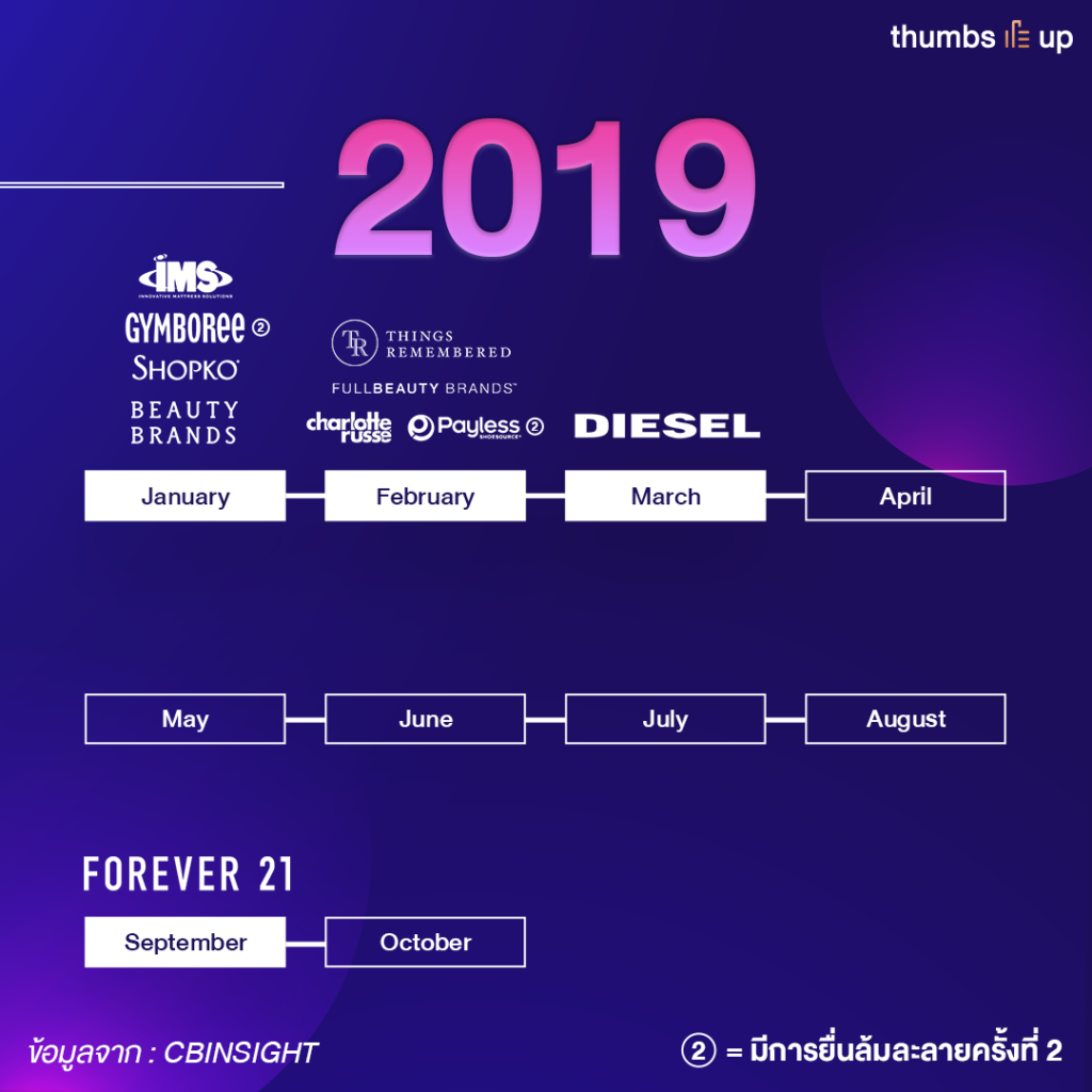 วันนี้เราขอเล่าถึงเคสของค้าปลีกในสหรัฐอเมริกา ที่เกิดต้องทำการปิดสาขาและยื่นล้มละลายไปเป็นจำนวนมาก โดยสรุปเป็น Timeline ค้าปลีกสหรัฐฯ ในช่วงปี 2558-2562 (ค.ศ.2015-2019) แบบคร่าวๆ ให้ได้เข้าใจกันดังนี้
