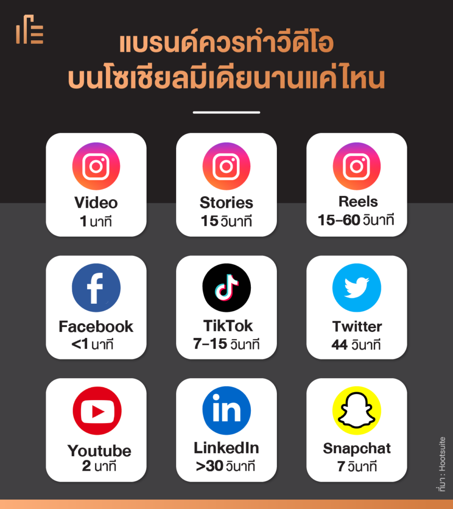 หนึ่งในคำถามที่นักการตลาดและแบรนด์ต่างกังวลกันตลอดทุกปีคือควรทำวีดีโอบนโซเชียลมีเดียนานแค่ไหน เพื่อให้เหมาะกับการรับชมในแต่ละแพลตฟอร์ม