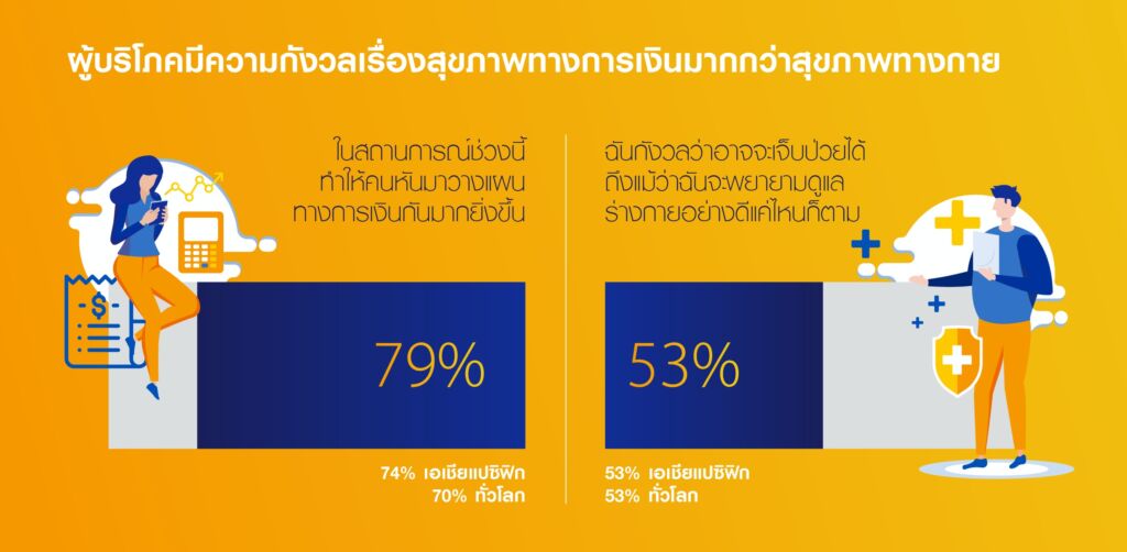 แม้ว่าประชากรทั่วโลกมีความกังวลในเรื่องสุขภาพร่างกาย กระนั้นก็ยังพบว่าผู้บริโภคชาวไทยและทั่วโลกกลับมีความกังวลด้านสุขภาพทางการเงินมากกว่า โดย 79 เปอร์เซ็นต์ ของผู้ตอบแบบสำรวจชาวไทยเห็นพ้องว่าสถานการณ์ปัจจุบันทำให้พวกเขาจำเป็นต้องมีการปฏิบัติตัวในเชิงรุกมากขึ้นกับการวางแผนด้านกรเงิน เปรียบเทียบกับอีก 53 เปอร์เซ็นต์ ที่บ่งชี้ถึงความกังวลของพวกเขาในเรื่องการเจ็บป่วย