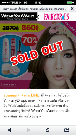 WearYouWant หนึ่งในผู้นำด้านธุรกิจอีคอมเมิร์ซเปิดตัวขายสินค้กลาง LINE Hot Deal แล้ว และจะมีดีลมานำเสนอใหม่ๆ ทุกอาทิตย์อย่างต่อเนื่อง โดย WearYouWant จะรับผิดชอบในส่วนของสินค้า การรับการสั่งซื้อ และส่งสินค้า ในขณะที่ LINE ทำหน้าที่เป็นช่องทางในการแจ้งลูกค้า LINE ที่ add official account “Hot Deal” เข้าไป หลังจากผ่านไปหนึ่งวันทาง WearYouWant กล่าวว่า ประสบความสำเร็จเป็นที่น่าพอใจไม่น้อย มีผู้สั่งซื้อกว่า 700 เซ็ตภายใน 1 วัน เริ่มตั้งแต่เวลา 12.30น. และขายหมดตอน 3ทุ่ม โดยใน 5 นาทีแรกก็มียอดสั่งซื้อกว่า 100 คำสั่งซื้อ ถือเป็นยอด Conversion Rate ประมาณ 3% ซึ่งสัปดาห์นี้ตัวผลิตภัณฑ์มาจาก FairyDrops สำหรับใครที่สนใจลองเข้าไป add official account ของ “Hot Deal” และพบกับสินค้าใหม่ๆ ในทุกสัปดาห์จาก WearYouWant ได้เลย