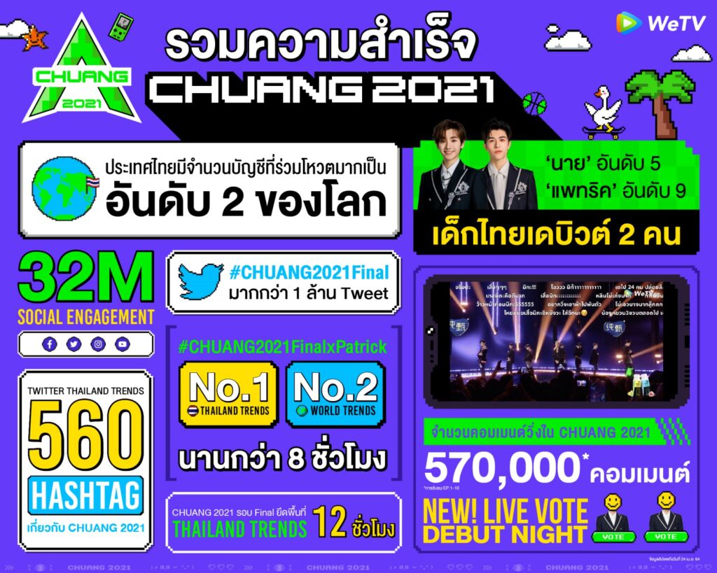 และในซีซันล่าสุด CHUANG 2021 ก็มีตัวแทนเด็กไทยเข้าร่วมการแข่งขันทั้งหมด 2 คน ได้แก่ “นาย – กรชิต บุญสถิต์ภักดี” และ “แพทริค – ณัฐวรรธ์ ฟิงค์เลอร์” ซึ่งเด็กไทยทั้งสองคนก็สามารถคว้าชัยชนะมาได้สำเร็จ โดยทุกคนได้ฝ่าฝันบททดสอบจนเดบิวต์เป็นศิลปินที่จีนได้อย่างเต็มตัว สิ่งเหล่านี้ คือ โอกาสทางธุรกิจที่เกิดขึ้นที่นำไปสู่การสร้างการเติบโตให้กับ WeTV ทั้งในแง่ผู้ใช้งาน และการร่วมมือทางธุรกิจกับพันธมิตรในหลากหลายอุตสาหกรรม