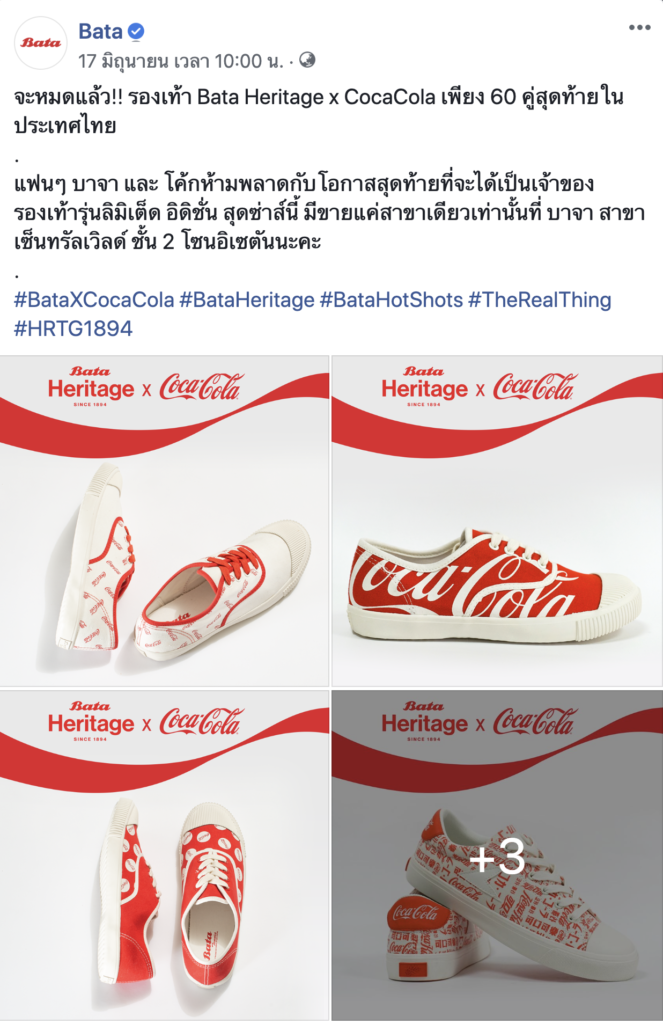 หรืออย่างล่าสุดที่ รองเท้า BATA กับทาง Coca Cola ได้ร่วมมือกันสร้างรองเท้ารุ่นใหม่ที่มีดีไซน์เก๋ๆ ด้วยจำนวนที่จำกัดก็ทำให้เกิดกระแสตอบรับที่ดีและขายหมดอย่างรวดเร็ว แน่นอนว่าสร้างความคาดหวังถึงสินค้าใหม่ๆ ที่จะเกิดขึ้นในอนาคตได้อีก งานนี้เหล่าแฟนของทั้งสองแบรนด์ก็ย่อมไม่พลาดในสินค้าเหล่านี้