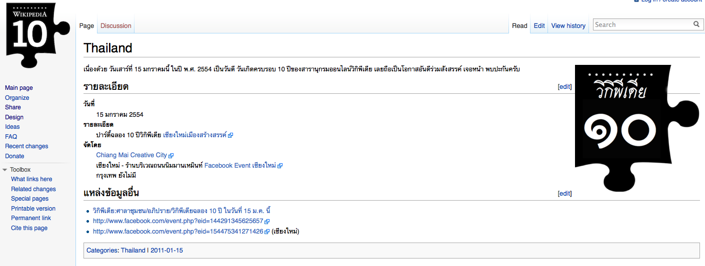 นึกว่าจะเป็นหมันไปซะแล้วสำหรับการเฉลิมฉลองครบรอบ 10 ปีวิกิพีเดียในประเทศไทย หลังจากที่ thumbsup เคยรายงานไปแล้วว่า 10 ปีวิกิพีเดียไร้เงาประเทศไทย