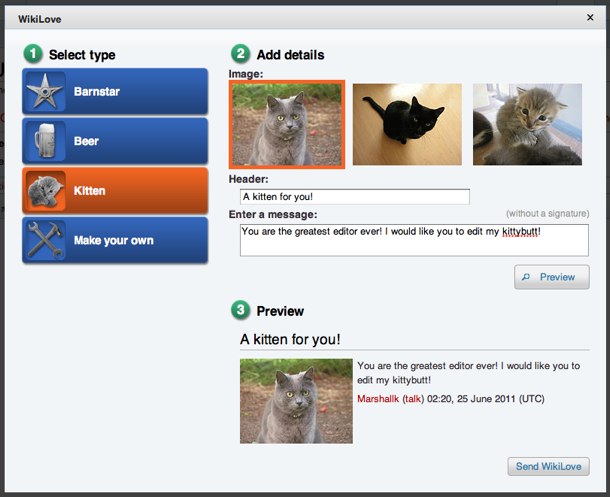 WikiLove นี้เป็นฟีเจอร์ที่ตรงๆ และเรียบง่าย โดยจะมีไอคอนรูปหัวใจแสดงถัดจากไอคอน Watchlist star บนหน้าผู้ใช้ คลิกเพื่อเลือกเมนู WikiLove โดยที่เราสามารถส่งรูปไอคอนน่ารักๆ ให้คนอื่นได้ เช่น เบียร์, ลูกแมว, ฯลฯ หรืออยากจะสร้างรูปเองก้ได้ตามต้องการ