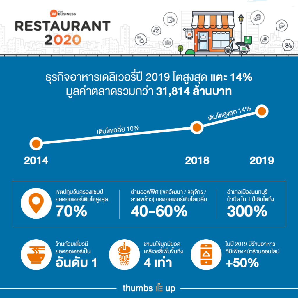 ภาพรวมของธุรกิจเดลิเวอรี่ในปัจจุบันที่เรียกว่าเติบโตอย่างก้าวกระโดด ทำให้มีเม็ดเงินภาพรวมตลาดสูงถึง 31,184 ล้านบาท และแน่นอนว่าย่านปทุมวัน (สยาม-สามย่าน) เป็นย่านที่มีออฟฟิศ คอนโดและบ้าน สั่งซื้ออาหารสูงที่สุดในรอบปี 2019 แต่ย่านออฟฟิศย่านวัฒนา-จตุจักร-ลาดพร้าว ก็ยังมีการสั่งผ่านเดลิเวอรี่เยอะมาก ที่เป็นม้ามืดคงหนีไม่พ้นอำเภอเมืองนนทบุรี ที่ใน 1 ปีมียอดการสั่งซื้อแบบเดลิเวอรี่สูงถึง 300% เลยทีเดียว