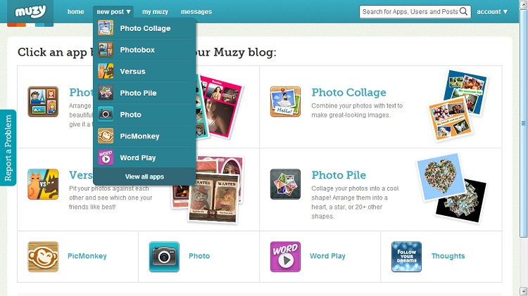 ชุดเครื่องมือเผยแพร่งานครีเอทีฟของ Muzy นั้นถือเป็นหนึ่งในจุดเด่นที่ถูกใจผู้ใช้ Muzy ทั่วโลก หากเข้าไปที่ Muzy.com ผู้ใช้จะพบโปรแกรมย่อยหรือ widget มากกว่า 50 รูปแบบสำหรับสร้างและเผยแพร่คอนเทนต์นั้นไปบนเพจ Facebook และ Twitter เช่น widget สำหรับสร้างภาพอัลบัมรูปพร้อมคำบรรยาย รวมถึง widget ทำกราฟฟิกข้อความที่สามารถเผยแพร่ได้ทันทีที่ตกแต่งเรียบร้อย