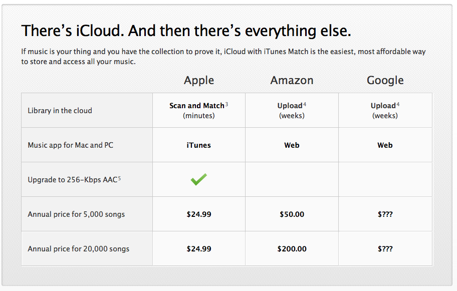 แต่เท่าที่สืบมาเพิ่มเติมได้ สิ่งที่น่าสนใจอีกประการก็คือ Apple ก็เซ็นสัญญากับค่ายเพลงยักษ์ใหญ่อย่าง Universal Music นำเสนอเพลงที่คุณอาจจะไม่เคยมีอยู่ใน iTunes ก็ได้ พูดง่ายๆ ในเชิงธุรกิจก็คือ Apple เป็นตัวกลางระหว่างค่ายเพลงและศิลปิน กับผู้ฟัง ใครที่มีเพลงๆ นั้นอยู่ใน iTunes แล้วก็ไม่ต้อง Sync แต่ถ้าอยากได้เพลงใหม่ๆ ก็เลือกซื้อใหม่ก็ได้เช่นกัน นึกภาพว่าเราอยากได้เพลงใหม่ของ Lady Gaga, U2 ก็ทำได้ไม่ยากเลย Apple ทำตารางเทียบกับคู่แข่งมาให้ดูกันจะจะเลย