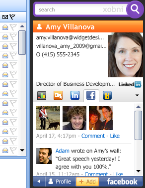 Xobni เป็นโปรแกรมเสริมหรือปลั๊กอินที่จะช่วยเก็บรวบรวมข้อมูลของ contact โดยการค้นหาข้อมูลจากเครือข่ายหลายแห่ง เช่น LinkedIn, Twitter, Facebook, Skype และ Hoovers ซึ่งในตอนแรก Xobni เปิดให้ใช้งานร่วมกับ Outlook เท่านั้น ก่อนที่จะพัฒนาจนรองรับ mail clients อื่นๆ รวมไปถึง Yahoo! Mail ด้วย