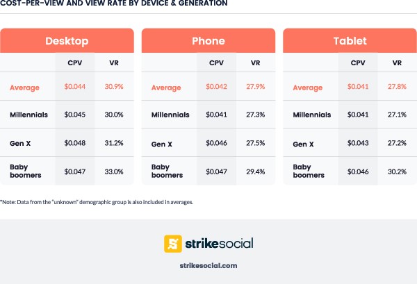 สถิติอื่นที่น่าสนใจจากการสำรวจของ Strike Social คือชาว YouTube นิยมชมโฆษณาบนคอมพิวเตอร์ตั้งโต๊ะมากที่สุด (33%) ตามมาด้วยแท็บเล็ต (30.2%) แต่สมาร์ทโฟนคืออุปกรณ์ที่ทำอัตราการคลิกโฆษณาหรือ click-through-rate ได้สูงที่สุด (1.19%) รายละเอียดเพิ่มเติมดูจากตารางด้านล่าง