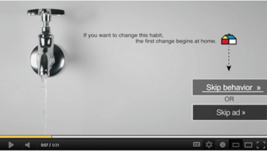 YouTube นั้นเปิดให้ผู้ชมกดข้ามโฆษณาได้เมื่อผ่านช่วงเวลา 5 วินาทีแรกไปแล้ว แต่สิ่งที่เอเจนซี่รายนี้ทำคือการวางปุ่ม “Skip ad” ไว้คู่กับปุ่ม “Skip behavior” โดยในโฆษณาเริ่มต้นด้วยการกล่าวว่า “ในเวลา 5 วินาที ทุกคนสามารถเปลี่ยนพฤติกรรมไม่ดีที่ทำเป็นประจำทุกวันได้” ก่อนจะเปลี่ยนเป็นภาพการผลาญพลังงานในบ้านโดยไร้ประโยชน์ เช่น การเปิดไฟทิ้งไว้ทั้งวัน ซึ่งใช้พลังงานเทียบเท่ากับเครื่องซักผ้าที่ใส่ผ้าจนเต็ม 3 เครื่อง โดยจุดประกายให้ผู้ชมคิดว่าการเปลี่ยนพฤติกรรมเหล่านี้สามารถเริ่มได้ที่บ้าน ก่อนที่ปุ่ม “Skip ad” และปุ่ม “Skip behavior” จะปรากฏขึ้นมาคู่กัน