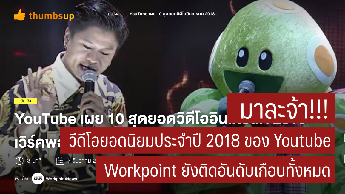เป็นธรรมเนียมไปแล้ว สำหรับการสรุปผลวีดีโอยอดนิยมประจำปี  2018 ที่ครั้งนี้ รายการ The Mask Singer ช่องเวิร์คพอยท์ ยังคงรั้งอันดับ 1 วิดีโอยอดนิยมบน YouTube ในหมวดทั่วไปติดต่อกัน 2 ปีซ้อน