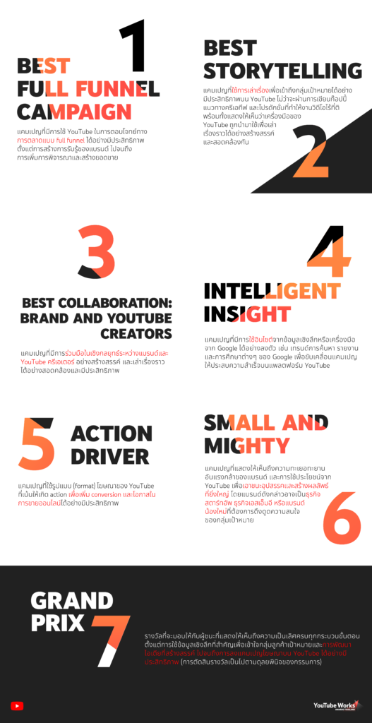 YouTube เปิดรับแคมเปญโฆษณาที่สนใจเข้าร่วมประกวดชิงรางวัล YouTube Works Awards ประเทศไทย ประจำปี 2565 ที่จัดขึ้นเพื่อยกย่องผลงานโฆษณาบน YouTube ที่มีความโดดเด่นและสร้างผลลัพธ์ทางธุรกิจได้อย่างมีประสิทธิภาพ
