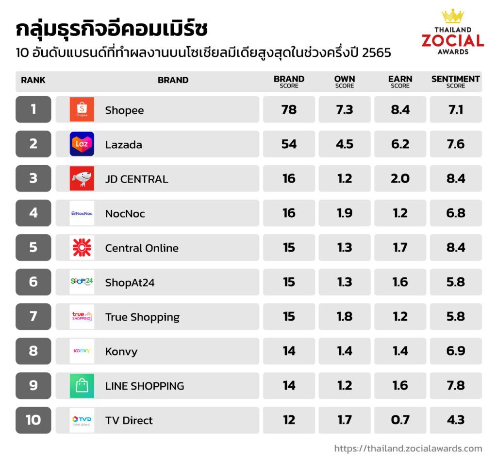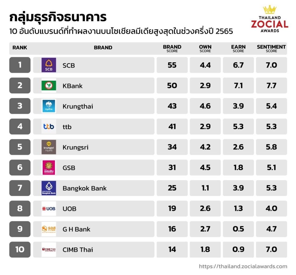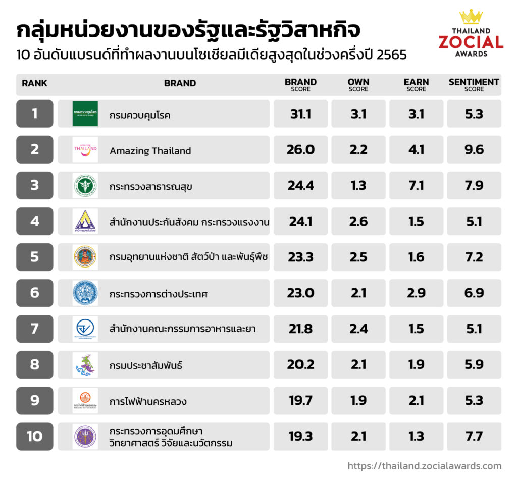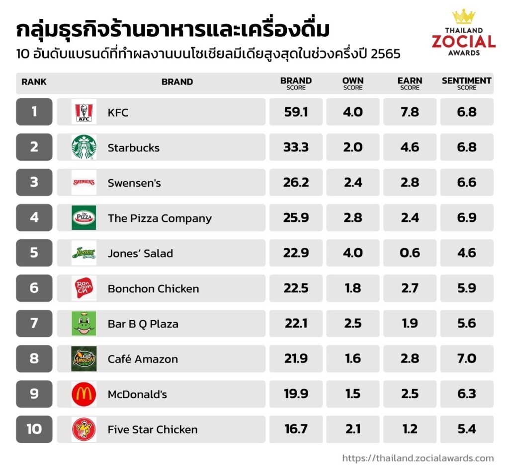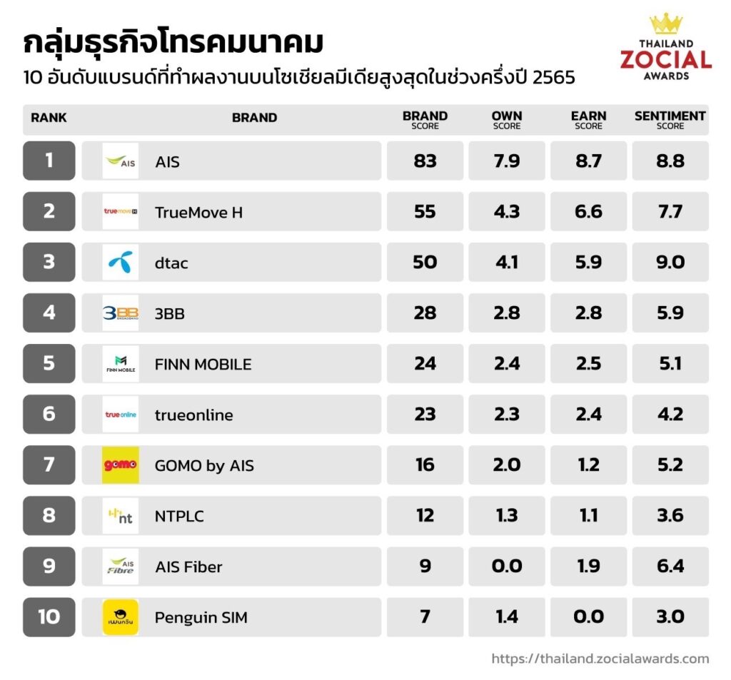โดย บริษัท ไวซ์ไซท์ (ประเทศไทย) จำกัด ได้พัฒนาค่าชี้วัด BRAND SCORE ผ่านเกณฑ์การวัดประสิทธิภาพการสื่อสาร และการพูดถึงแบรนด์บนโซเชียลมีเดีย หรือ WISESIGHT BRAND METRIC ร่วมกับคณะที่ปรึกษาในหลากหลายแวดวงเพื่อทำการเปิดโผ 10 อันดับแบรนด์ที่ทำผลงานได้ดีที่สุดบนโลกโซเชียลในช่วงครึ่งแรกของปี 2565 โดยได้ทำการวัดผลประสิทธิภาพการสื่อสาร และการถูกพูดถึงแบรนด์ใน 4 ช่องทาง คือ Facebook, Instagram, Twitter และ YouTube โดยให้ความสำคัญในสองมุมมองหลักคือ 1) การวัดประสิทธิภาพเชิงปริมาณ และ 2) การวัดประสิทธิภาพเชิงคุณภาพ