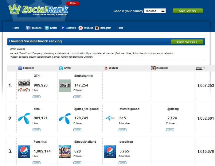 ยังคงอัพเดตอย่างต่อเนื่องสำหรับ Zocial Rank ของคนดังแวดวงอินเทอร์เน็ตอย่าง “ภาวุธ พงษ์วิทยภานุ” ล่าสุดทาง Zocial Rank ได้เพิ่มระบบจัดอันดับของแบรนด์ต่างๆ ในประเทศไทย ที่ใช้ Social Network ในการเข้าถึงกลุ่มลูกค้ามากที่สุด โดยนับจากผลรวมของ Facebook Like, Twitter Follower, Youtube Subscribe, Instagram Follower วันนี้ทางทีมเลยฝากข่าวมาให้นักการตลาดไทย ช่วยกันใส่แบรนด์ตัวเองเข้าระบบ เพื่อให้นักการตลาดทุกคนเห็นสภาพการแข่งขันชัดเจนยิ่งขึ้น