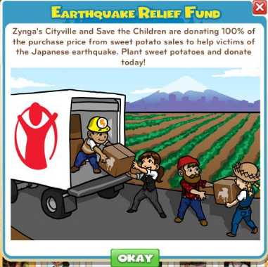 เรียกว่าใจบุญกันแบบสุดๆ ไปเลย สำหรับ Zynga กับการเปิดให้ผู้เล่น สามารถมีส่วนร่วมกับการบริจากเงินช่วยเหลือผู้ประสบภัยจากเหตุการณ์สึนามิที่ญี่ปุ่น โดยผู้เล่นเกมจะสามารถบริจาคได้จากการซื้อไอเท็มหรือ Virtual Goods จากเกมอย่าง FrontierVille, FarmVille และ CityVille ได้